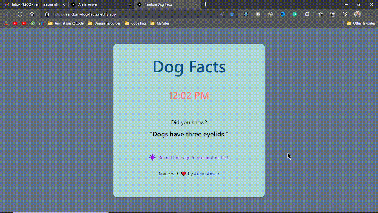 This app shows unique and unknown facts about dogs. It uses an API that I have built using express js. Just refresh the page to get a new fact :)